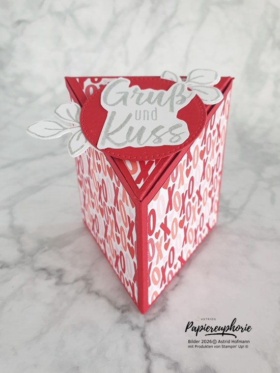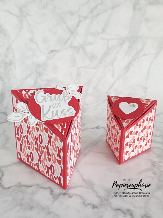 Letztes Jahr habe ich auf Instagram desöfteren bei den Challenges von Peggy (@papelero_and_more) und Meli (@stempelnaht) mitgemacht. Und am Jahresende gab es unter anderem auch eine Anleitung für eine Dreieckbox. Die habe ich nun wieder zur Hand genommen und neben der Originalgröße auch noch eine etwas größere Box gemacht.