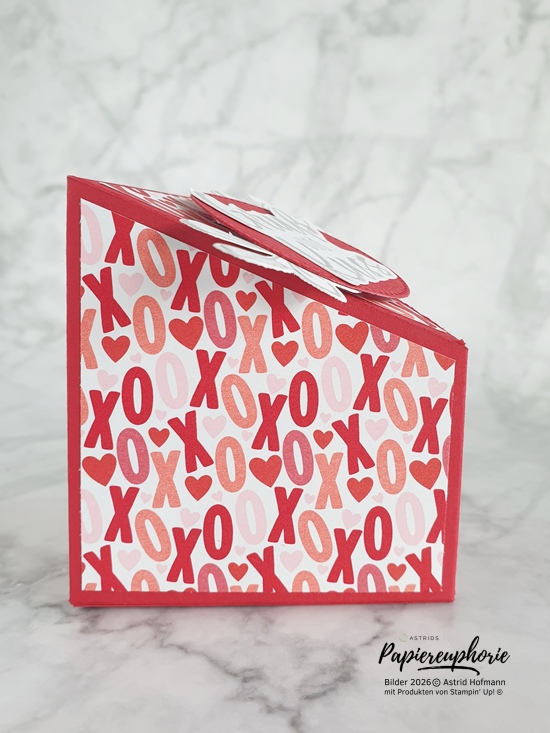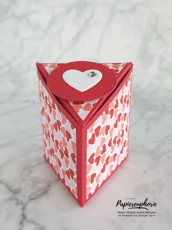 Ein neuer Katalog bietet ja immer eine Fülle an tollen, neuen Designerpapieren, Stempeln, Stanzen usw. Da fällt die Wahl gar nicht mal so leicht. Der Valentinstag wird ja hier in Österreich nicht so richtig zelebriert, aber Herzen haben immer Saison. Und so kann man ja (jederzeit) lieben Menschen auch kleine Geschenke bringen, die sagen „ich hab dich lieb“.