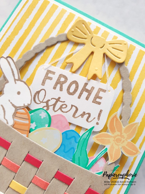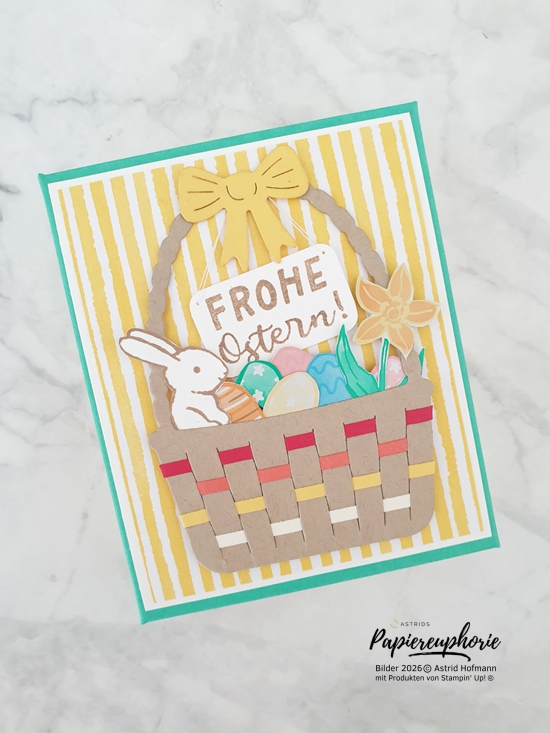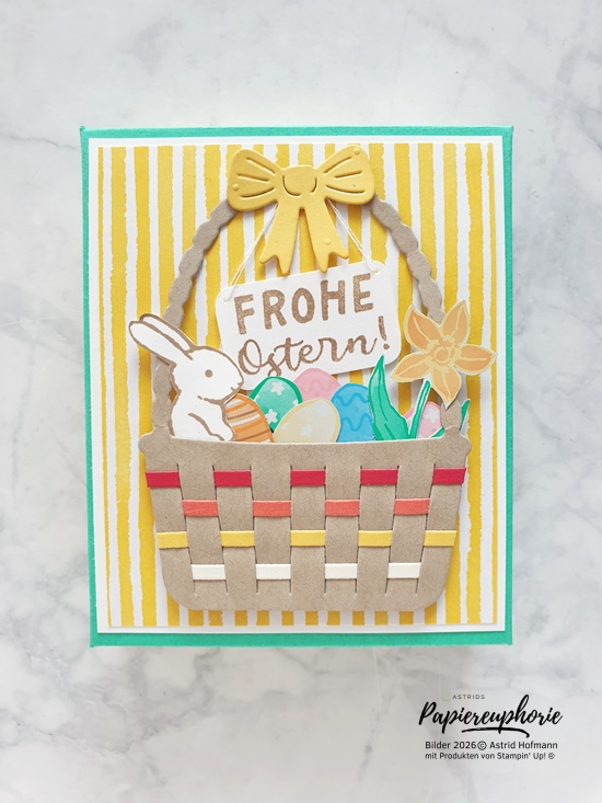 Die tolle Stanzform mit dem Korb, bei dem (ebenfalls) gestanzte Streifen eingewoben werden können ist ein toller Hingucker. In den Korb füllte ich ein paar Ostereier und ein Blümchen (beides aus dem Designerpapier ausgeschnitten) und natürlich das süße Häschen (gestempelt und ausgestanzt).