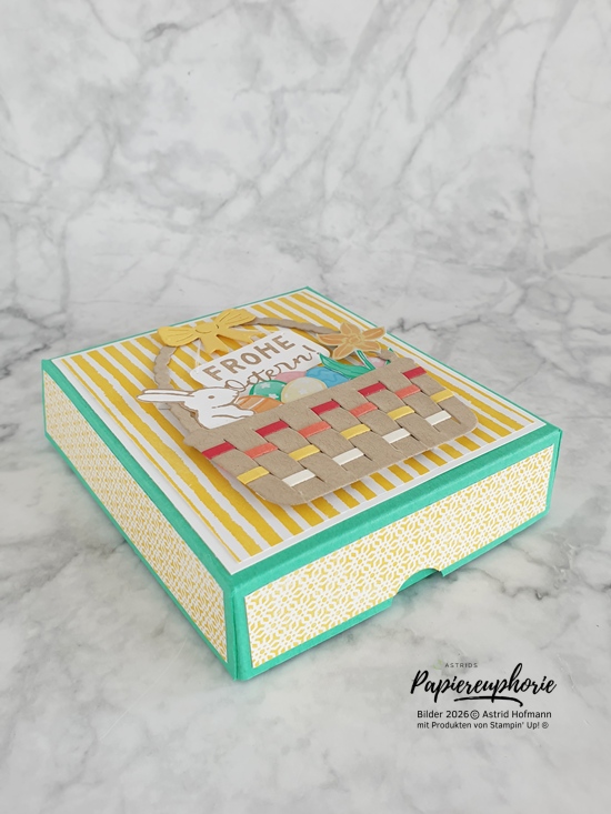 Die Box ist eine einfache Pizzabox – nur eben rechteckig und nicht quadratisch. Ursprünglich wollte ich die Seitenflächen undekoriert lassen, aber mit dem zart gemusterten, gelben Designerpapier gefällt es mir nun doch besser.
