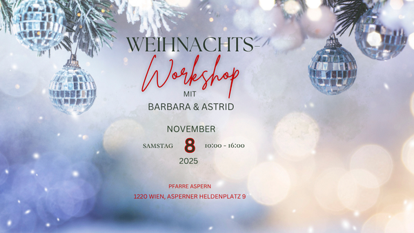 Wir (Barbara und ich) laden euch herzlichst zu unserem Weihnachts-Workshop 2025 ein und freuen uns, euch wieder ein ganztägiges live-Treffen am 8.11.2025 in der Pfarre Aspern, 1220 Wien, Asperner Heldenplatz 9, zum Preis von € 95,- anbieten zu können.